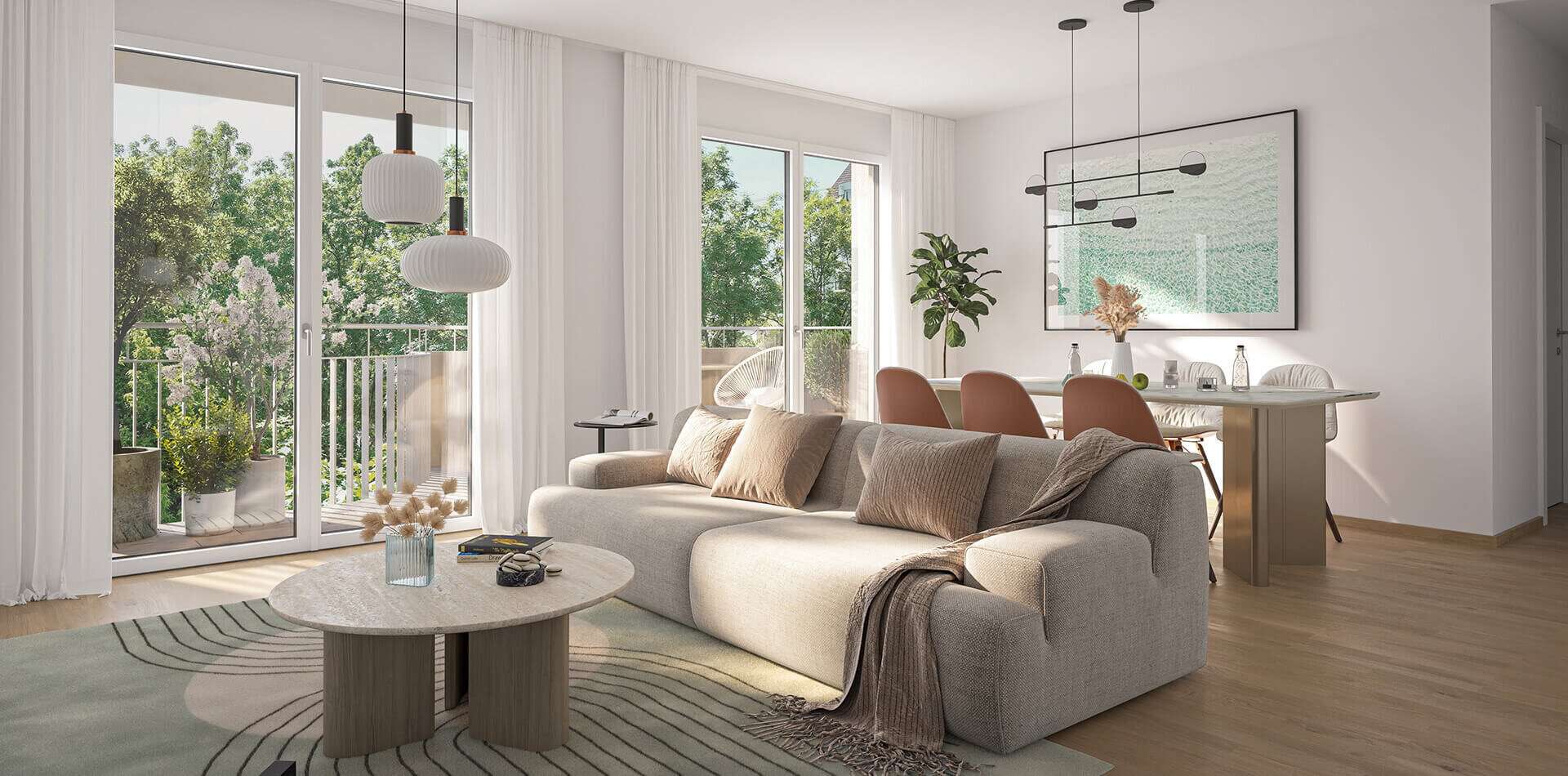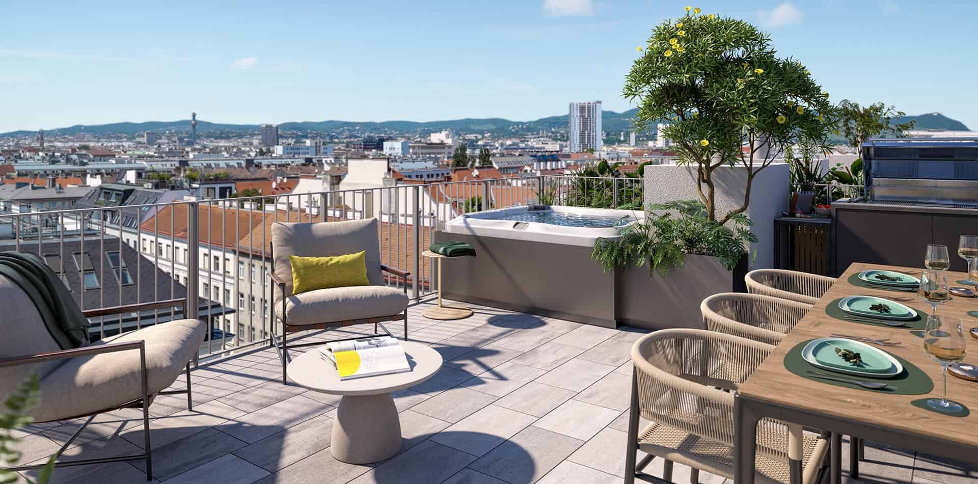 Die modernen 2-Zimmer-Wohnungen sind ideal für Singles und Paare. Mit 37 bis 45 m² vereinen sie einen offenen Wohn-/Essbereich, ein separates Schlafzimmer sowie Zugang zur Terrasse oder zum eigenen Garten. Höchsten Wohnkomfort bieten auch die Maisonette-, Garten- und Hofwohnungen mit 3 oder 4 Zimmern. Die Gartenwohnungen verfügen über private Grünflächen, während Hofwohnungen direkten Zugang zum begrünten Innenhof haben. Die Dachgeschoßwohnungen und Penthouses bieten luxuriöses Wohnen mit 43 bis 126 m² und 2 bis 4 Zimmern. Atemberaubende Ausblicke und ein begehrter Rückzugsort im Herzen der Stadt zeichnen diese Einheiten aus.