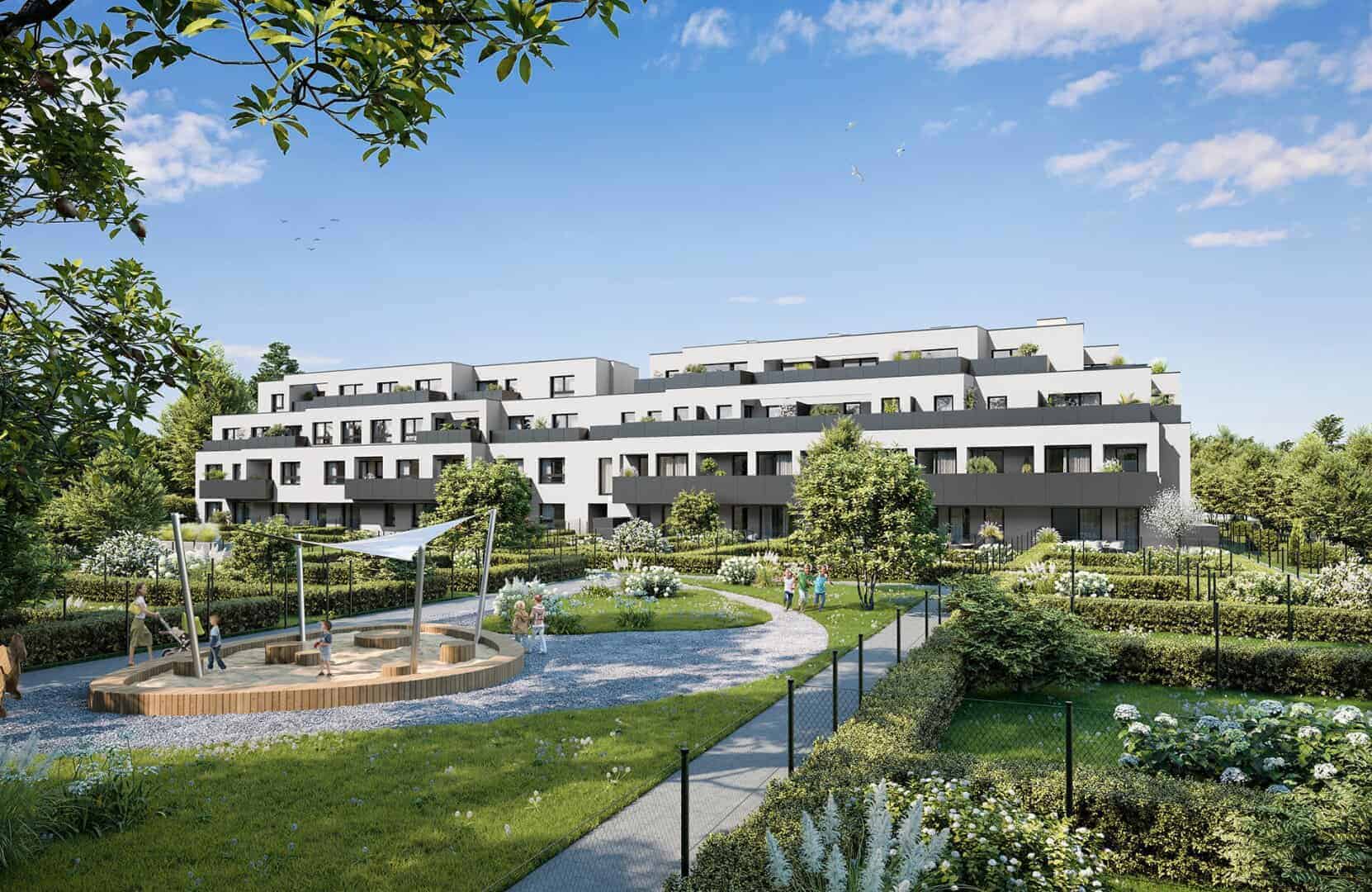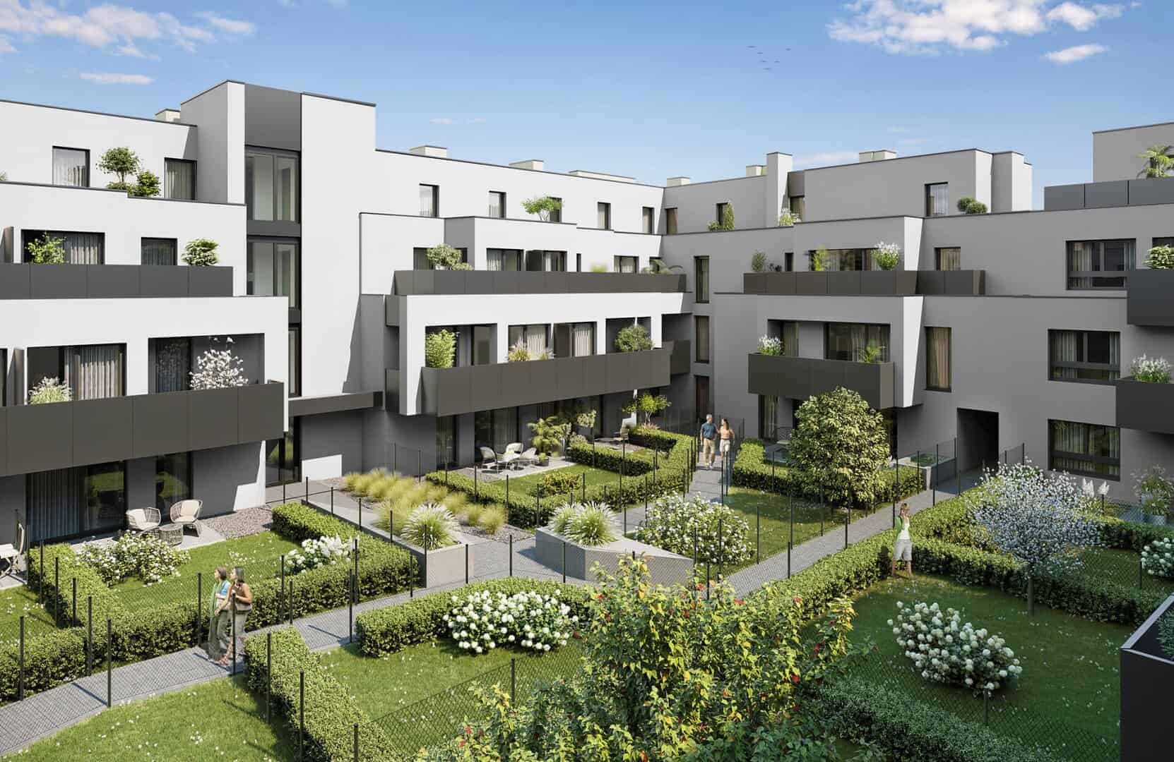 Für alle Eigentümer, auch in den oberen Geschossen, offeriert sich die besondere optionale Möglichkeit eines eigenen Gartenabteils. Alle Gärten werden mit Strom- und Wasseranschluss ausgeführt.