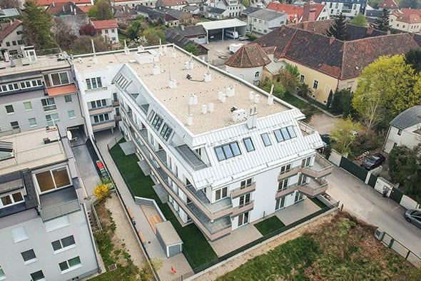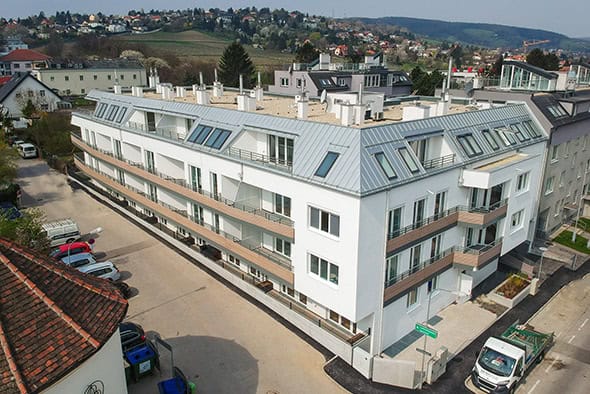 Das Wohnbauprojekt besteht aus einem kompakten L-förmigen Baukörper mit insgesamt 40 allseitig ausgerichteten Eigentums- bzw. Vorsorgewohnungen.